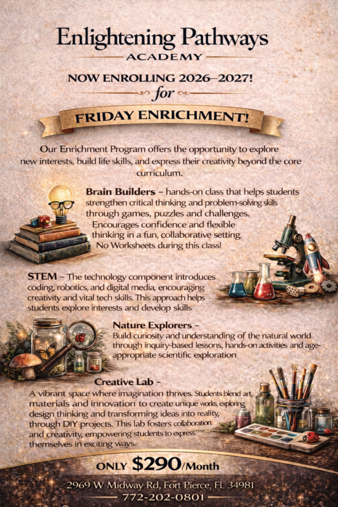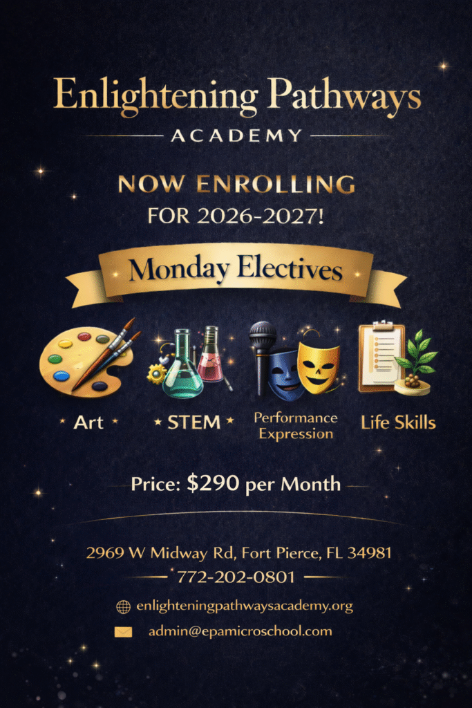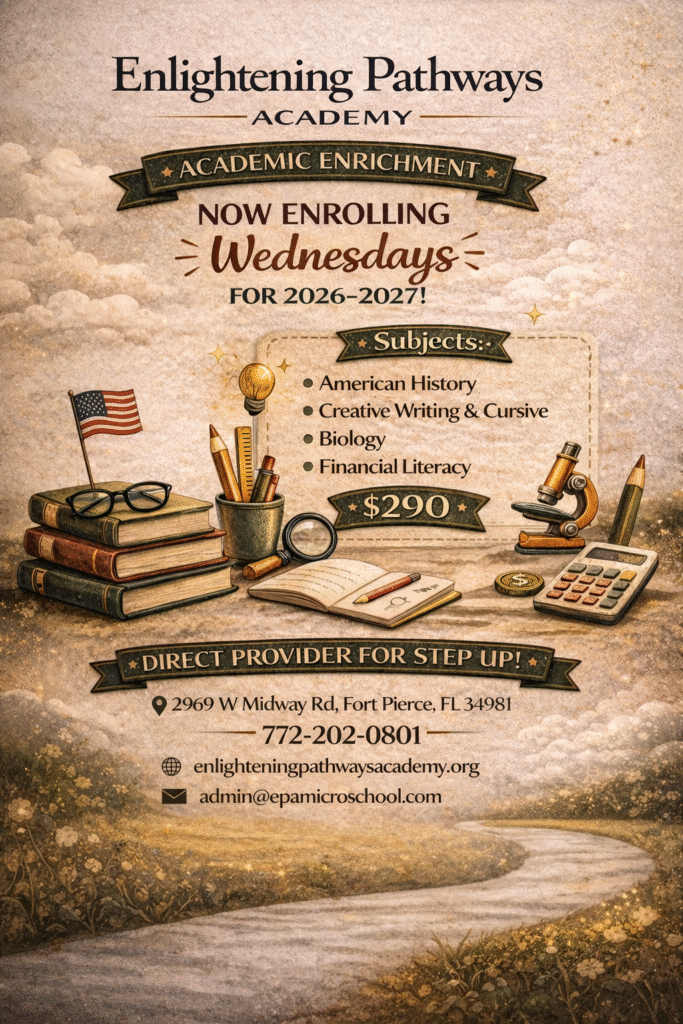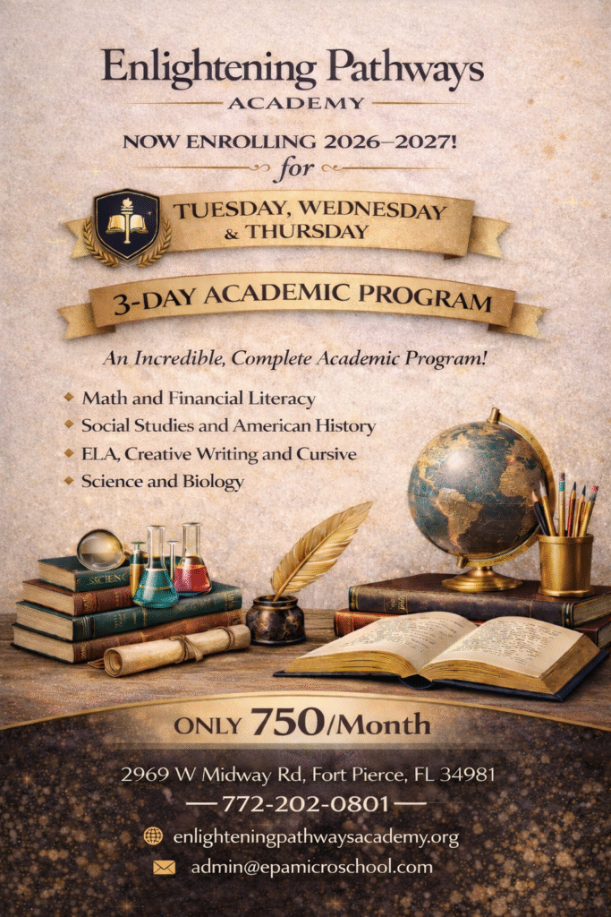 Give your child a complete and enriching educational experience with our 3-Day Academic Program at Enlightening Pathways Academy. Designed for students in grades 1st–8th, this program combines the full academic offerings of our Tuesdays & Thursdays curriculum with the enriching subjects from our Wednesday program.