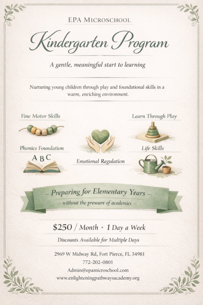 This program reflects what kindergarten was always meant to be—a gentle, meaningful transition into learning that prepares children for the elementary years without pressure, while honoring their developmental pace and curiosity.